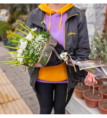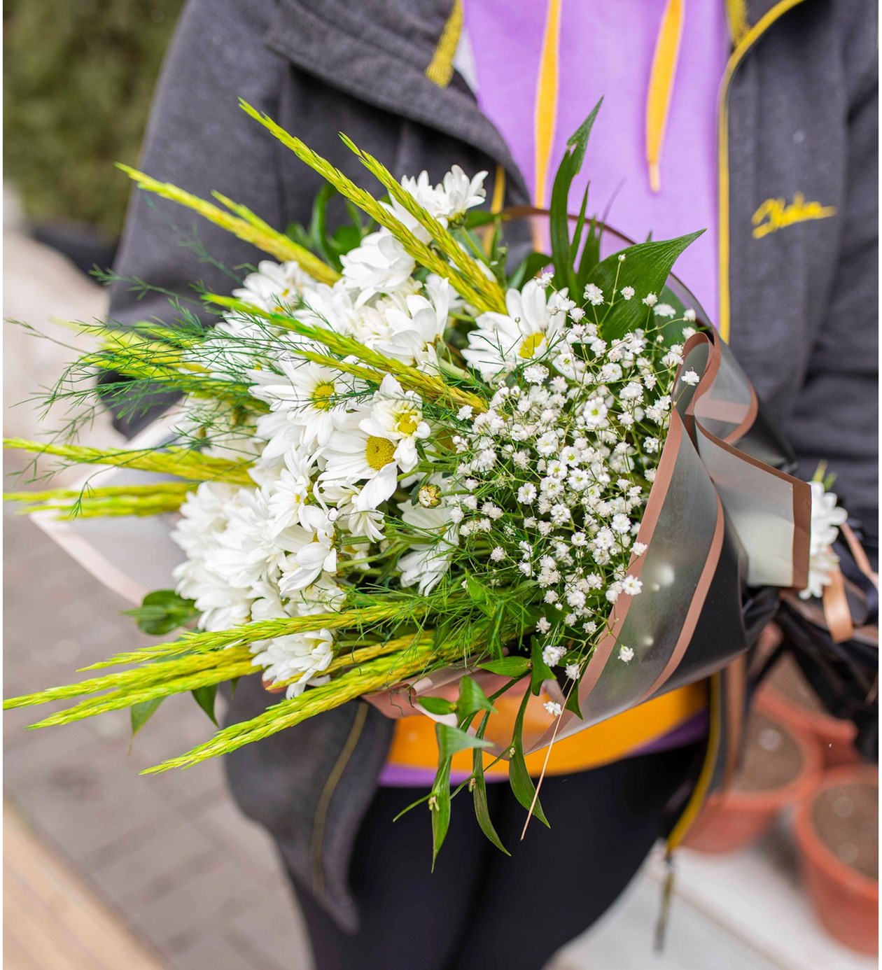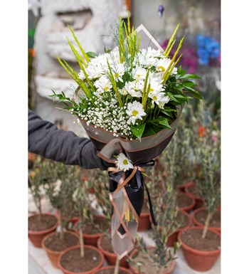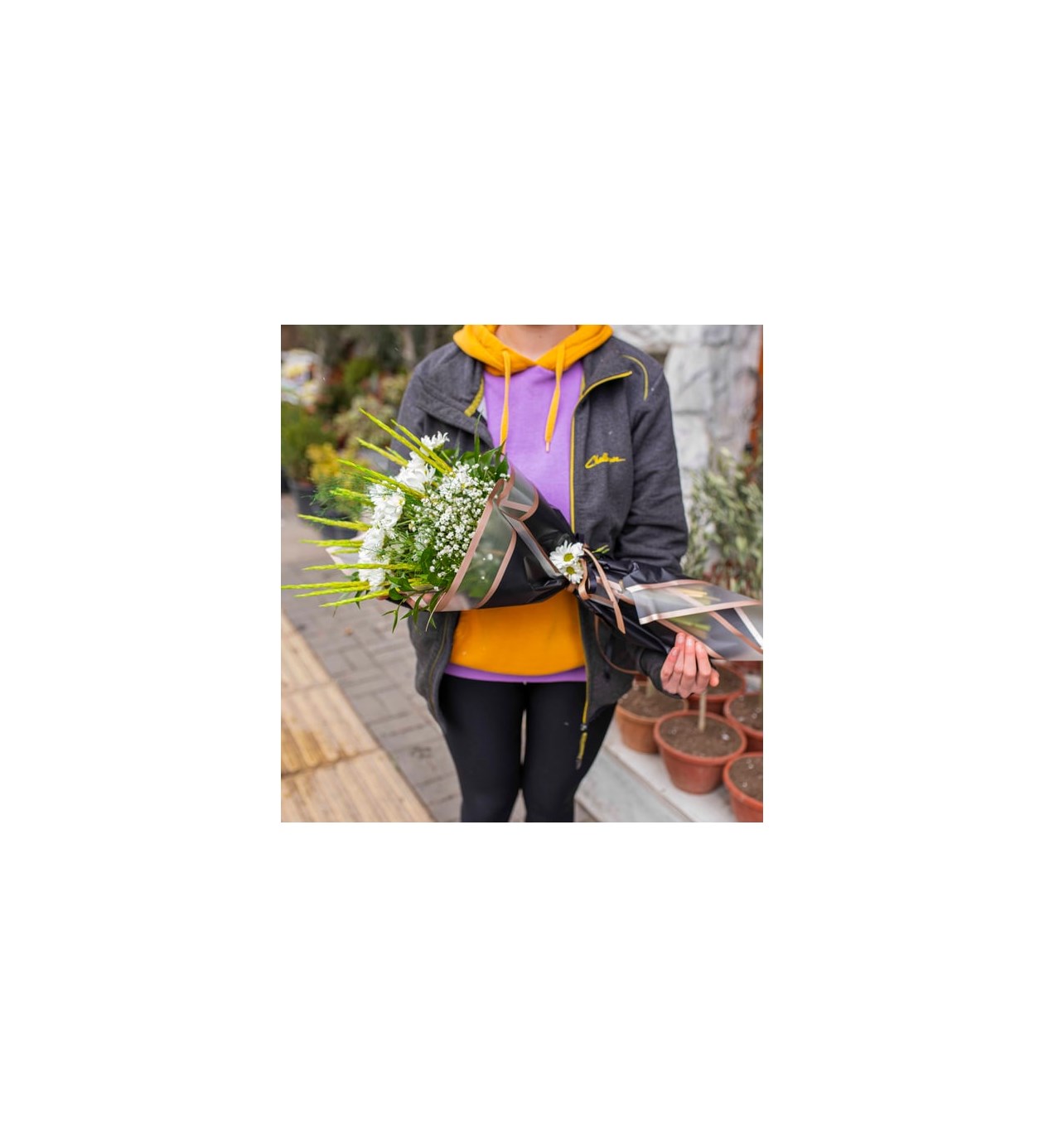 Tasarımda bir demet beyaz kır çiçeği çiçek kağıdına sarılarak hazırlanmıştır.