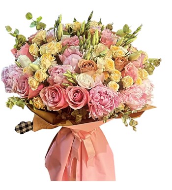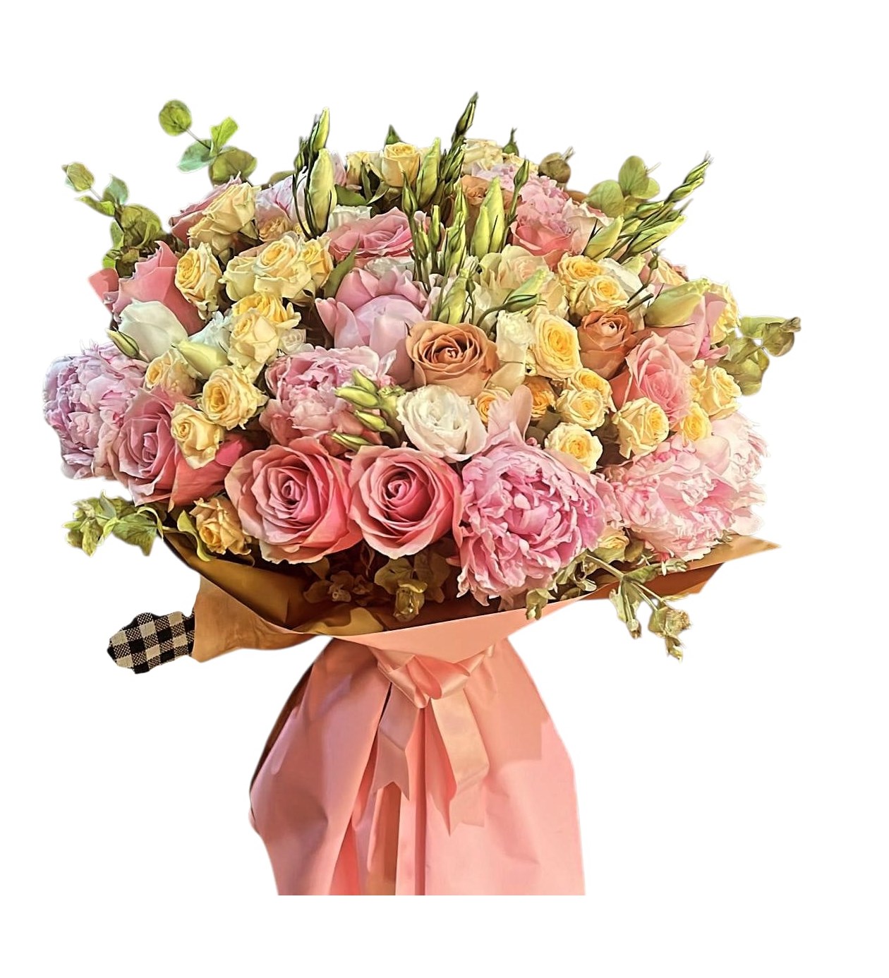 Tasarımda pembe mevsim çiçeklerinden oluşan buket bulunmaktadır