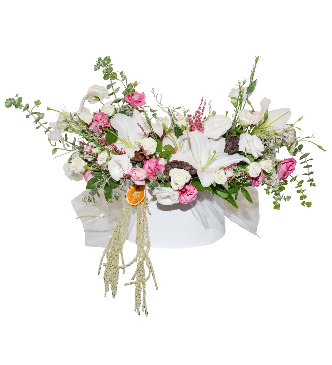 Tasarımda kadife kutu içerisinde mevsim çiçekleri eklenerek hazırlanmıştır.